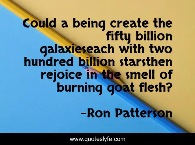 This page presents the quote "Could a being create the fifty billion galaxieseach with two hundred billion starsthen rejoice in the smell of burning goat flesh?". Author of this quote is Ron Patterson. This quote is about animal-sacrifice, god, christianity, religion,.