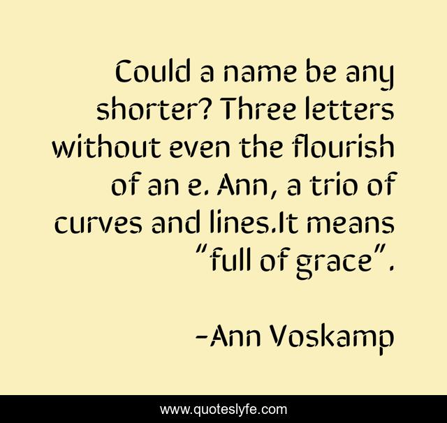 This page presents the quote "Could a name be any shorter? Three letters without even the flourish of an e. Ann, a trio of curves and lines.It means “full of grace”.". Author of this quote is Ann Voskamp. This quote is about ann, grace, name-meaning,.
