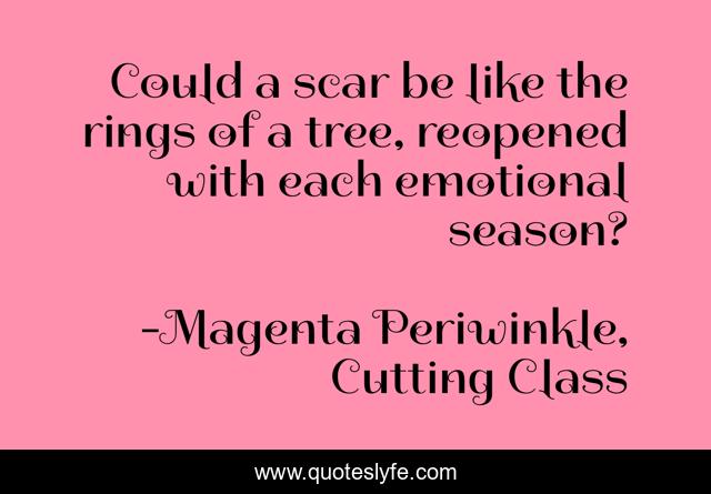 This page presents the quote "Could a scar be like the rings of a tree, reopened with each emotional season?". Author of this quote is Magenta Periwinkle, Cutting Class. This quote is about sentimental-bulls-t, goth, love, geeks, teen-agnst, first-love, bullying, magenta-periwinkle, cutting,.