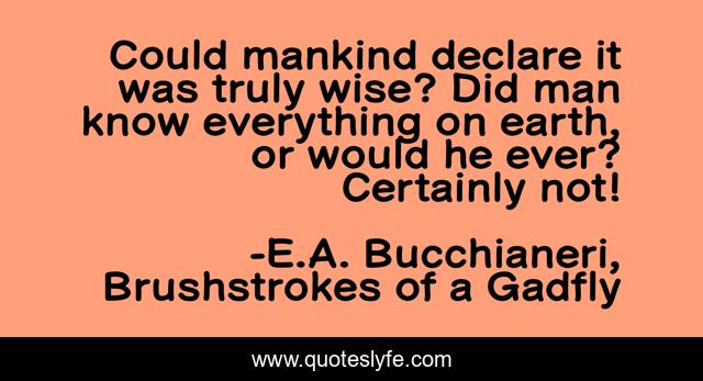 This page presents the quote "Could mankind declare it was truly wise? Did man know everything on earth, or would he ever? Certainly not!". Author of this quote is E.A. Bucchianeri, Brushstrokes of a Gadfly. This quote is about limitations, learning, stupidity-of-man, knowledge, gadfly, wisdom, stupidity, mankind, truth,.