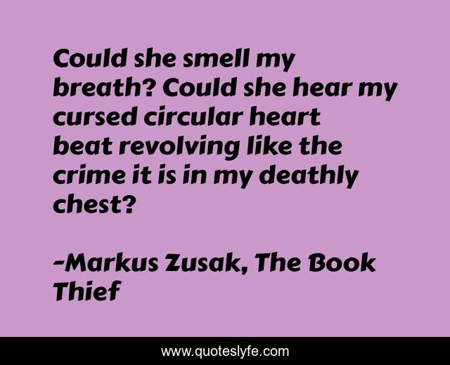 This page presents the quote "Could she smell my breath? Could she hear my cursed circular heart beat revolving like the crime it is in my deathly chest?". Author of this quote is Markus Zusak, The Book Thief. .