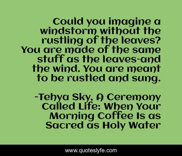 This page presents the quote "Could you imagine a windstorm without the rustling of the leaves? You are made of the same stuff as the leaves–and the wind. You are meant to be rustled and sung.". Author of this quote is Tehya Sky, A Ceremony Called Life: When Your Morning Coffee Is as Sacred as Holy Water. This quote is about spiritual, love, unconditional-love, consciousness, life-wisdom, mystic, inspirational, wisdom, spirituality,.
