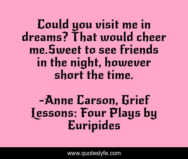 This page presents the quote "Could you visit me in dreams? That would cheer me.Sweet to see friends in the night, however short the time.". Author of this quote is Anne Carson, Grief Lessons: Four Plays by Euripides. This quote is about touching, friendship,.