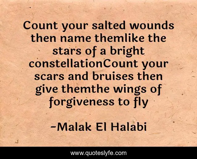 This page presents the quote "Count your salted wounds then name themlike the stars of a bright constellationCount your scars and bruises then give themthe wings of forgiveness to fly". Author of this quote is Malak El Halabi. This quote is about healing-the-past, self-love, forgiveness, healing, wounds,.
