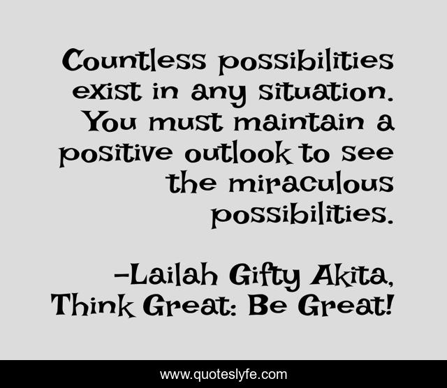 "Lailah Gifty Akita, Think Great: Be Great! Quotes." Quoteslyfe.com, 2025. Fri. 05 Dec. 2025. <https://www.quoteslyfe.com/quote/Countless-possibilities-exist-in-any-situation-You-84319>.