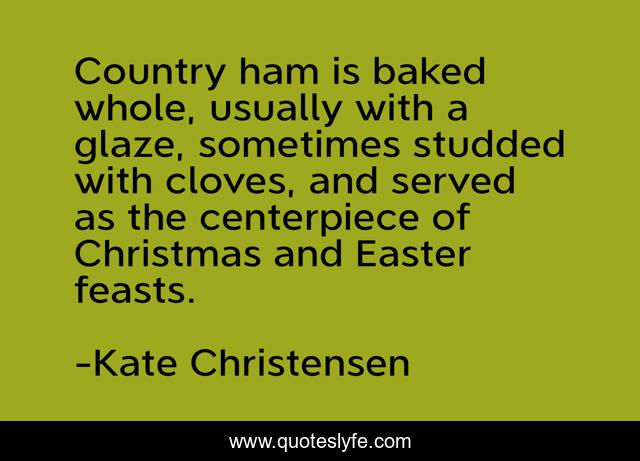 This page presents the quote "Country ham is baked whole, usually with a glaze, sometimes studded with cloves, and served as the centerpiece of Christmas and Easter feasts.". Author of this quote is Kate Christensen. This quote is about country, sometimes, whole,.