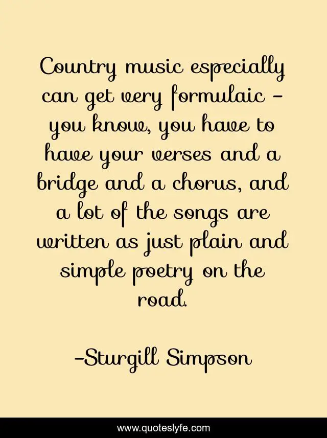 This page presents the quote "Country music especially can get very formulaic - you know, you have to have your verses and a bridge and a chorus, and a lot of the songs are written as just plain and simple poetry on the road.". Author of this quote is Sturgill Simpson. This quote is about simple, music, road,.