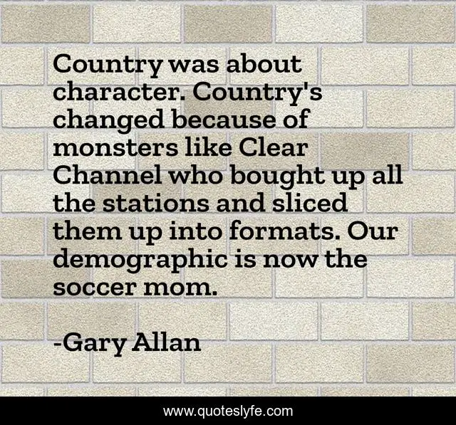 This page presents the quote "Country was about character. Country's changed because of monsters like Clear Channel who bought up all the stations and sliced them up into formats. Our demographic is now the soccer mom.". Author of this quote is Gary Allan. This quote is about country, soccer, character,.