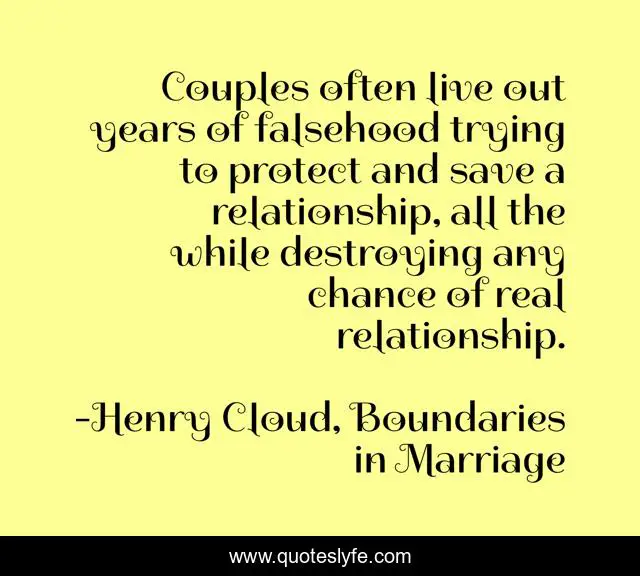 This page presents the quote "Couples often live out years of falsehood trying to protect and save a relationship, all the while destroying any chance of real relationship.". Author of this quote is Henry Cloud, Boundaries in Marriage. This quote is about christian-marriage, marriage, honesty, relationship,.