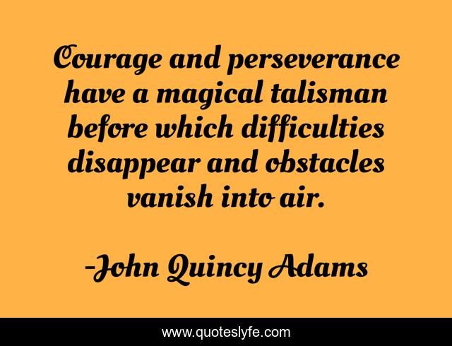 This page presents the quote "Courage and perseverance have a magical talisman before which difficulties disappear and obstacles vanish into air.". Author of this quote is John Quincy Adams. .