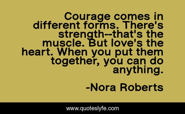 This page presents the quote "Courage comes in different forms. There's strength--that's the muscle. But love's the heart. When you put them together, you can do anything.". Author of this quote is Nora Roberts. .