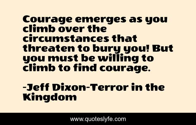 This page presents the quote "Courage emerges as you climb over the circumstances that threaten to bury you! But you must be willing to climb to find courage.". Author of this quote is Jeff Dixon-Terror in the Kingdom. This quote is about fear, courage, inspiration,.