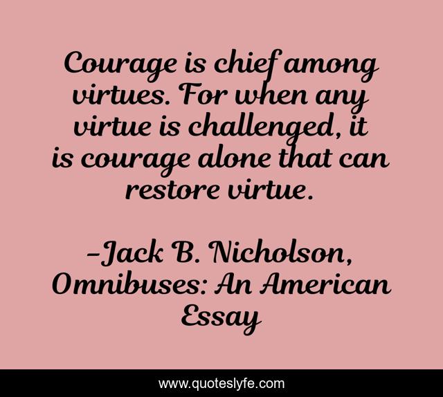 This page presents the quote "Courage is chief among virtues. For when any virtue is challenged, it is courage alone that can restore virtue.". Author of this quote is Jack B. Nicholson, Omnibuses: An American Essay. .