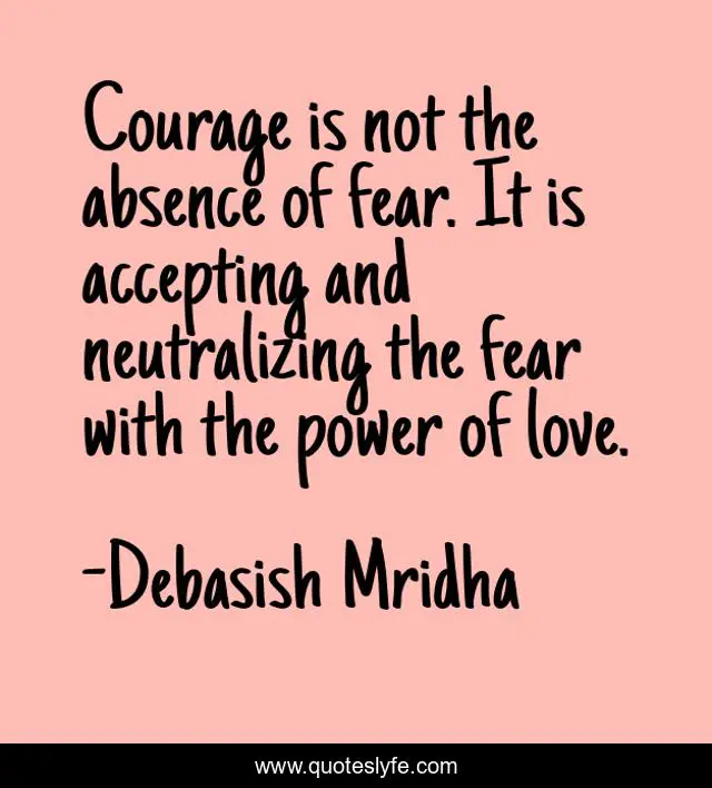 This page presents the quote "Courage is not the absence of fear. It is accepting and neutralizing the fear with the power of love.". Author of this quote is Debasish Mridha. This quote is about philosophy, debasish-mridha, power-of-love, absence-of-fear, quotes, courage, inspirational, enthusiasm, fear,.