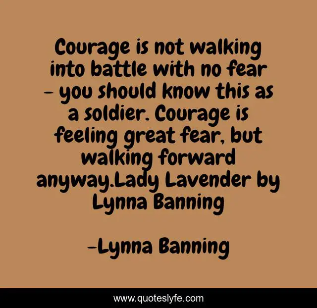 This page presents the quote "Courage is not walking into battle with no fear - you should know this as a soldier. Courage is feeling great fear, but walking forward anyway.Lady Lavender by Lynna Banning". Author of this quote is Lynna Banning. .