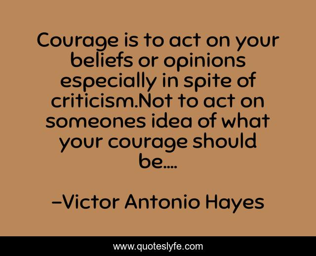 This page presents the quote "Courage is to act on your beliefs or opinions especially in spite of criticism.Not to act on someones idea of what your courage should be....". Author of this quote is Victor Antonio Hayes. .