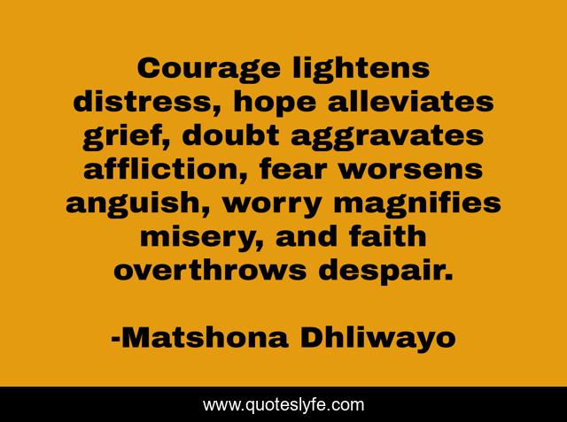 "Matshona Dhliwayo Quotes." Quoteslyfe.com, 2025. Mon. 08 Dec. 2025. <https://www.quoteslyfe.com/quote/Courage-lightens-distress-hope-alleviates-grief-doubt-83221>.