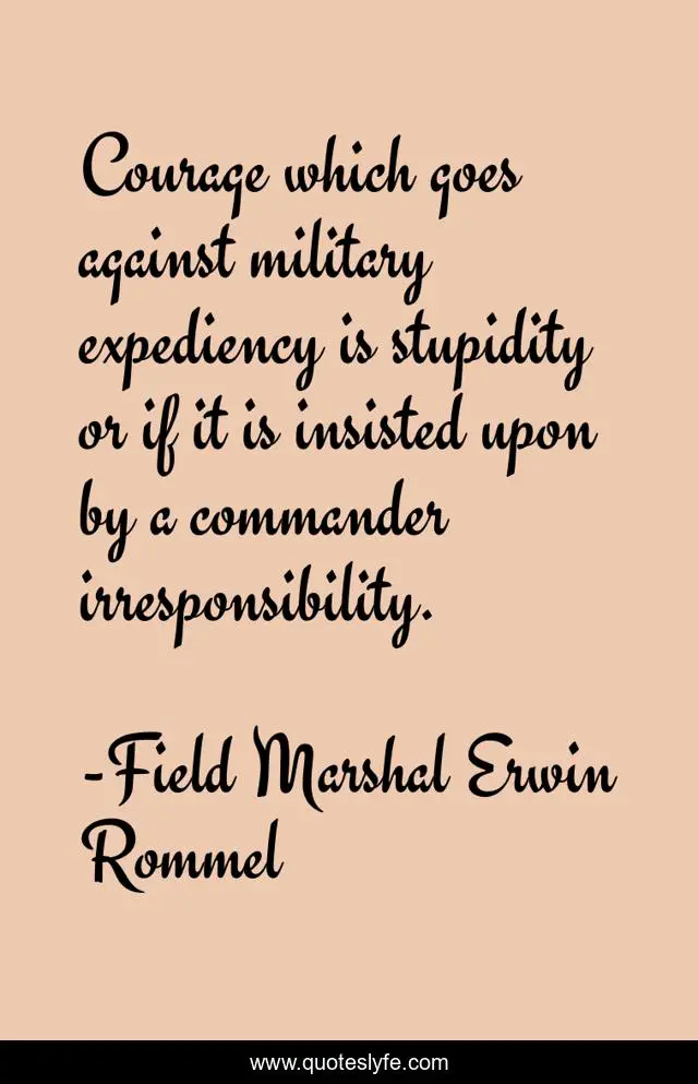 This page presents the quote "Courage which goes against military expediency is stupidity or if it is insisted upon by a commander irresponsibility.". Author of this quote is Field Marshal Erwin Rommel. .