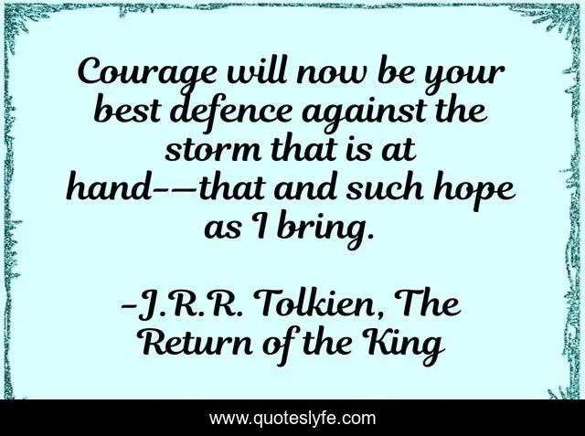 This page presents the quote "Courage will now be your best defence against the storm that is at hand-—that and such hope as I bring.". Author of this quote is J.R.R. Tolkien, The Return of the King. This quote is about gandalf, courage, war, hope,.