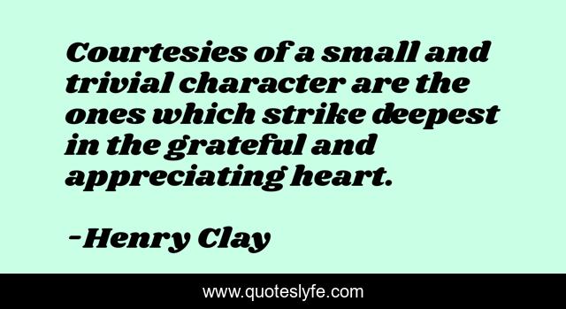 This page presents the quote "Courtesies of a small and trivial character are the ones which strike deepest in the grateful and appreciating heart.". Author of this quote is Henry Clay. This quote is about gifts, gratitude, courtesy, blessings, thankfulness,.