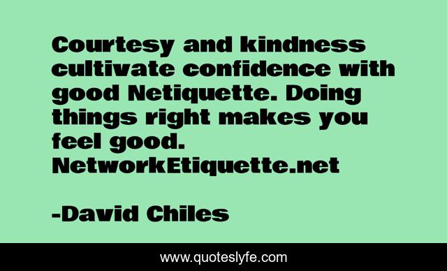 This page presents the quote "Courtesy and kindness cultivate confidence with good Netiquette. Doing things right makes you feel good. NetworkEtiquette.net". Author of this quote is David Chiles. This quote is about etiquette, school, surfing, social-networking, engagement, education, manners, netiquette, courtesy,.