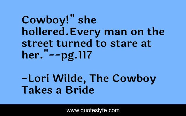 This page presents the quote "Cowboy!" she hollered.Every man on the street turned to stare at her."--pg.117". Author of this quote is Lori Wilde, The Cowboy Takes a Bride. This quote is about romance, funny, comedy, sweet,.
