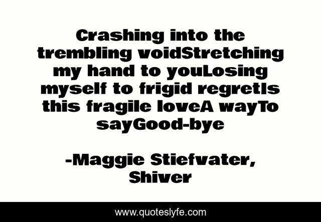 This page presents the quote "Crashing into the trembling voidStretching my hand to youLosing myself to frigid regretIs this fragile loveA wayTo sayGood-bye". Author of this quote is Maggie Stiefvater, Shiver. .