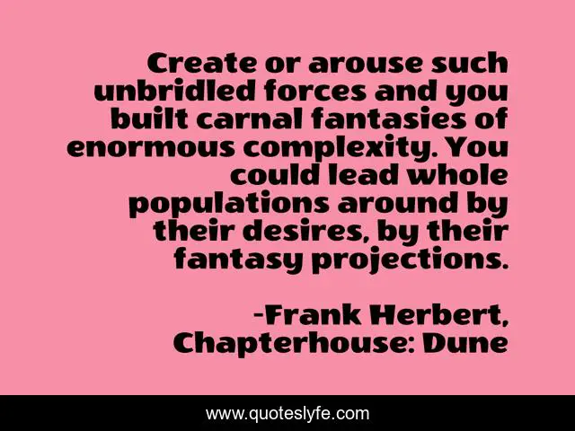 This page presents the quote "Create or arouse such unbridled forces and you built carnal fantasies of enormous complexity. You could lead whole populations around by their desires, by their fantasy projections.". Author of this quote is Frank Herbert, Chapterhouse: Dune. This quote is about desire, myth, power, drives, fantasy, politics, urges, projection,.