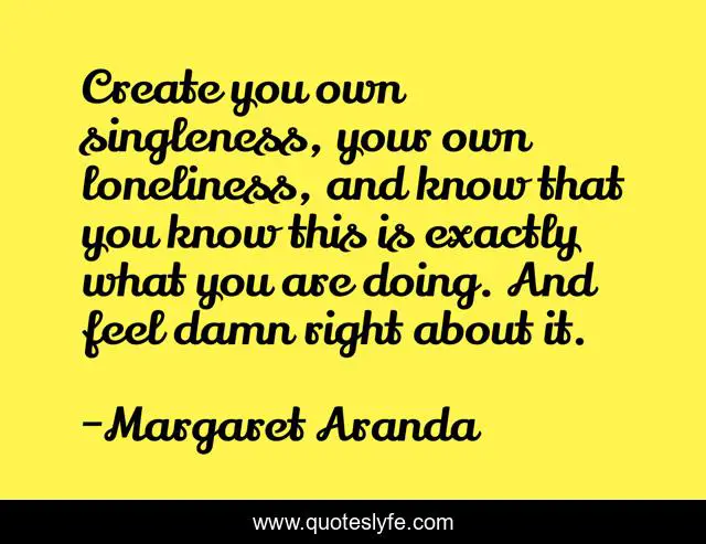 This page presents the quote "Create you own singleness, your own loneliness, and know that you know this is exactly what you are doing. And feel damn right about it.". Author of this quote is Margaret Aranda. This quote is about single-life, decisions, single-woman, choices,.