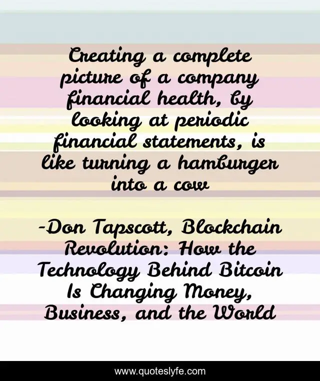 This page presents the quote "Creating a complete picture of a company financial health, by looking at periodic financial statements, is like turning a hamburger into a cow". Author of this quote is Don Tapscott, Blockchain Revolution: How the Technology Behind Bitcoin Is Changing Money, Business, and the World. This quote is about joke, finance,.
