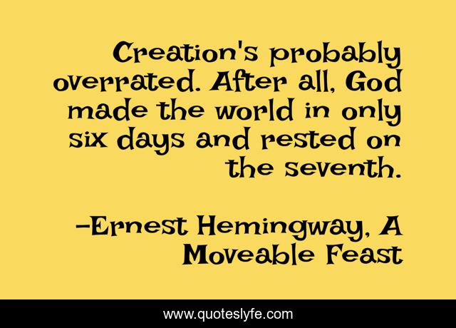 This page presents the quote "Creation's probably overrated. After all, God made the world in only six days and rested on the seventh.". Author of this quote is Ernest Hemingway, A Moveable Feast. This quote is about god, creation, creativity, overrated, seventh,.