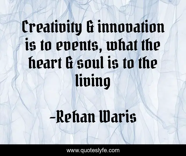 This page presents the quote "Creativity & innovation is to events, what the heart & soul is to the living". Author of this quote is Rehan Waris. This quote is about heart, life, ideas, creativity, soul, rehan-waris, idea, event-planning, human,.