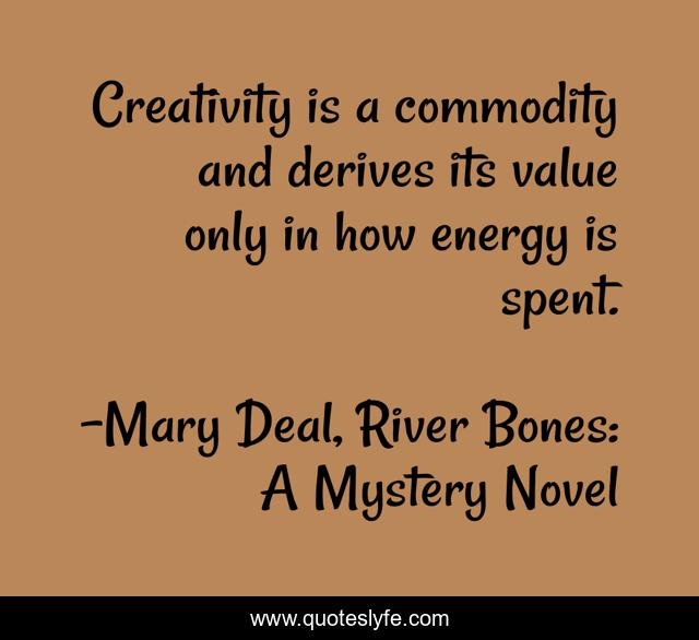 This page presents the quote "Creativity is a commodity and derives its value only in how energy is spent.". Author of this quote is Mary Deal, River Bones: A Mystery Novel. This quote is about fiction, genre-fiction, mystery-suspense, thriller, novels,.