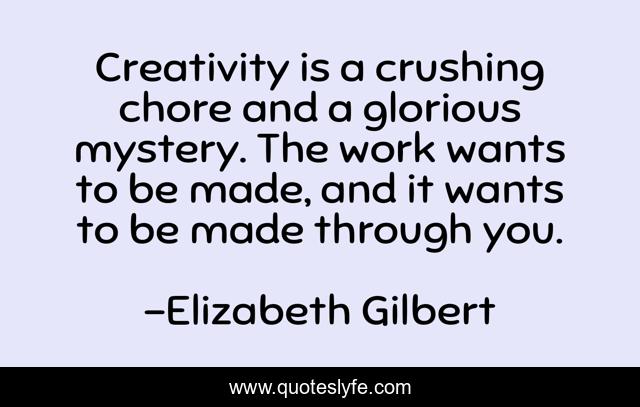 This page presents the quote "Creativity is a crushing chore and a glorious mystery. The work wants to be made, and it wants to be made through you.". Author of this quote is Elizabeth Gilbert. This quote is about big-magic, creativity, elizabeth-gilbert,.