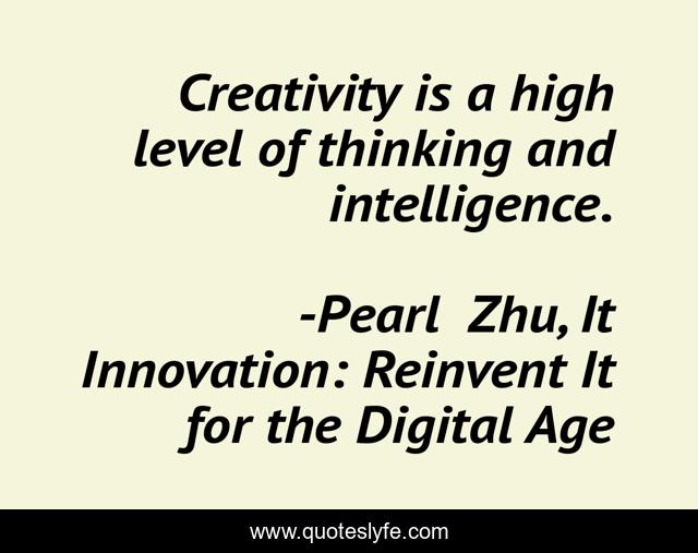This page presents the quote "Creativity is a high level of thinking and intelligence.". Author of this quote is Pearl Zhu, It Innovation: Reinvent It for the Digital Age. This quote is about intelligence, creativity,.