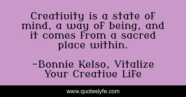 This page presents the quote "Creativity is a state of mind, a way of being, and it comes from a sacred place within.". Author of this quote is Bonnie Kelso, Vitalize Your Creative Life. This quote is about art, creativity, inspirational, enthusiasm,.