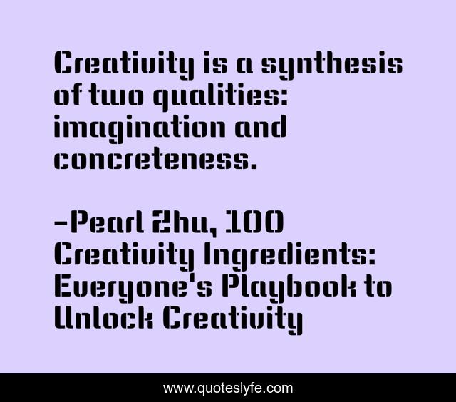 This page presents the quote "Creativity is a synthesis of two qualities: imagination and concreteness.". Author of this quote is Pearl Zhu, 100 Creativity Ingredients: Everyone's Playbook to Unlock Creativity. This quote is about imagination, creativity,.