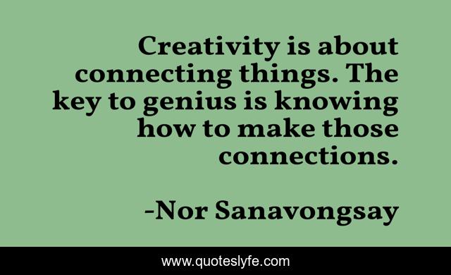 This page presents the quote "Creativity is about connecting things. The key to genius is knowing how to make those connections.". Author of this quote is Nor Sanavongsay. This quote is about intelligence, creativity, inspirational, enthusiasm,.