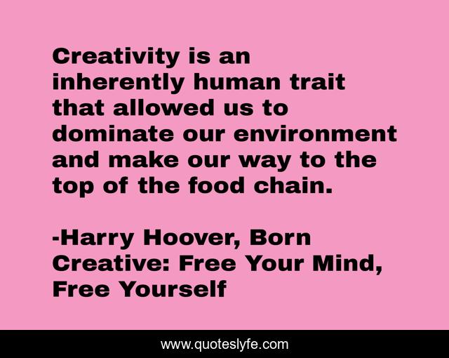 This page presents the quote "Creativity is an inherently human trait that allowed us to dominate our environment and make our way to the top of the food chain.". Author of this quote is Harry Hoover, Born Creative: Free Your Mind, Free Yourself. This quote is about creativity, creative-process,.