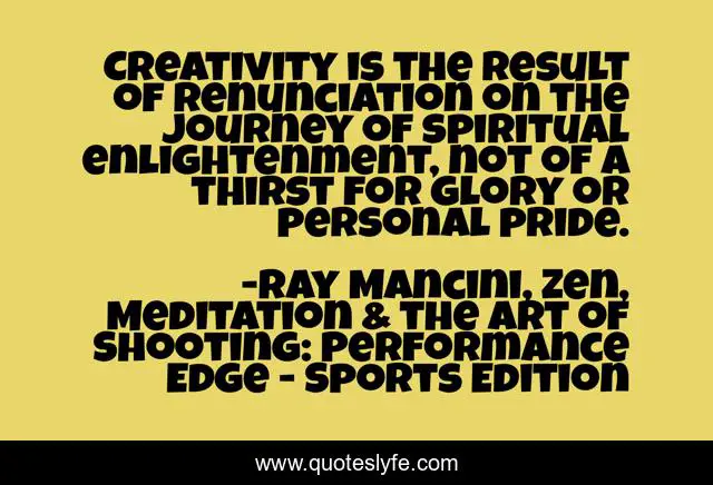 This page presents the quote "Creativity is the result of renunciation on the journey of spiritual enlightenment, not of a thirst for glory or personal pride.". Author of this quote is Ray Mancini, Zen, Meditation & the Art of Shooting: Performance Edge - Sports Edition. This quote is about life, pride, art, glory, renunciation, creativity, spirituality, enlightenment,.