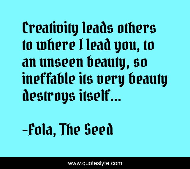This page presents the quote "Creativity leads others to where I lead you, to an unseen beauty, so ineffable its very beauty destroys itself...". Author of this quote is Fola, The Seed. This quote is about enthusiasm, creativity, beauty, inspirational,.