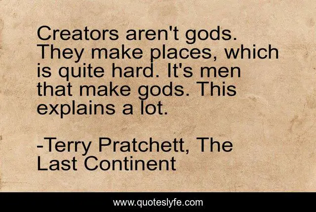 This page presents the quote "Creators aren't gods. They make places, which is quite hard. It's men that make gods. This explains a lot.". Author of this quote is Terry Pratchett, The Last Continent. .