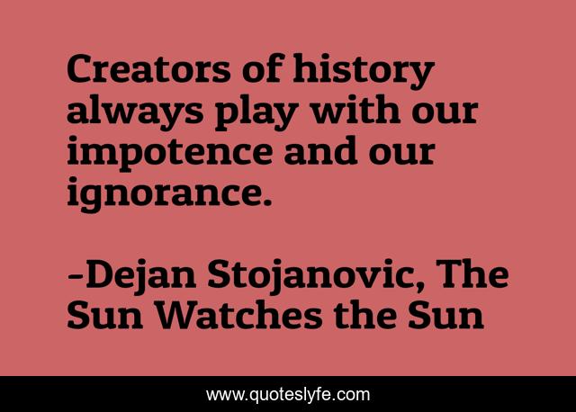 This page presents the quote "Creators of history always play with our impotence and our ignorance.". Author of this quote is Dejan Stojanovic, The Sun Watches the Sun. This quote is about play, literature, dejan-stojanovic, philosophy, history, ignorance, poetry, quotes, books,.