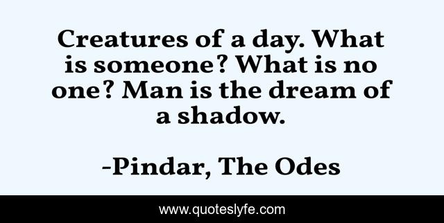 This page presents the quote "Creatures of a day. What is someone? What is no one? Man is the dream of a shadow.". Author of this quote is Pindar, The Odes. This quote is about existence, philosophy, human-nature,.