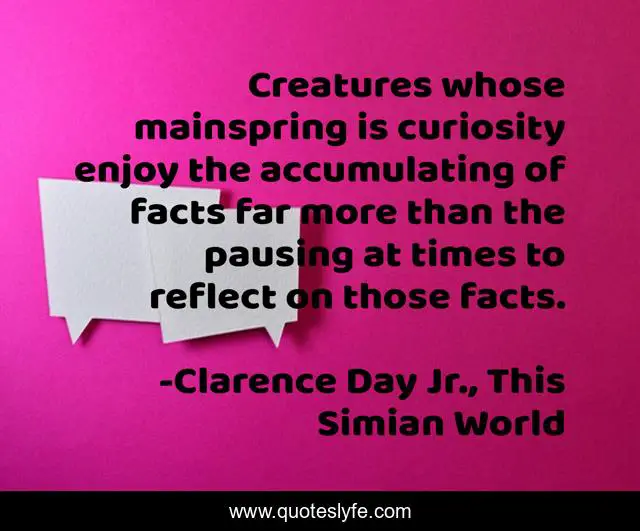This page presents the quote "Creatures whose mainspring is curiosity enjoy the accumulating of facts far more than the pausing at times to reflect on those facts.". Author of this quote is Clarence Day Jr., This Simian World. This quote is about facts, human-nature, reflecting, curiosity, thinking,.