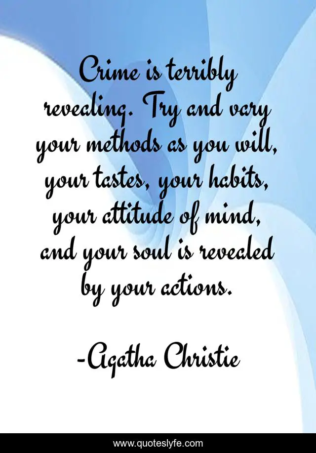 This page presents the quote "Crime is terribly revealing. Try and vary your methods as you will, your tastes, your habits, your attitude of mind, and your soul is revealed by your actions.". Author of this quote is Agatha Christie. This quote is about mind, soul,.