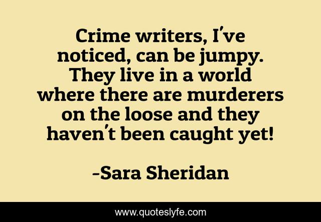 This page presents the quote "Crime writers, I've noticed, can be jumpy. They live in a world where there are murderers on the loose and they haven't been caught yet!". Author of this quote is Sara Sheridan. This quote is about funny, humour, crime, writers, genre, writing, comedy, murderers,.