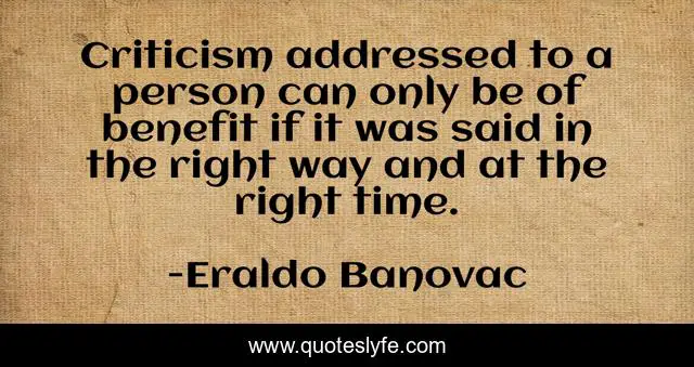 This page presents the quote "Criticism addressed to a person can only be of benefit if it was said in the right way and at the right time.". Author of this quote is Eraldo Banovac. This quote is about criticism, confidence, motivational, benefits, positive, philosophy, right-way, sociology, optimistic,.