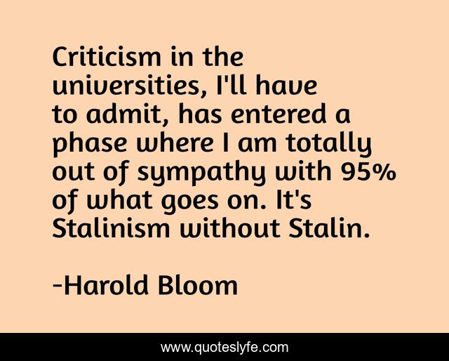 This page presents the quote "Criticism in the universities, I'll have to admit, has entered a phase where I am totally out of sympathy with 95% of what goes on. It's Stalinism without Stalin.". Author of this quote is Harold Bloom. This quote is about criticism, admit,.