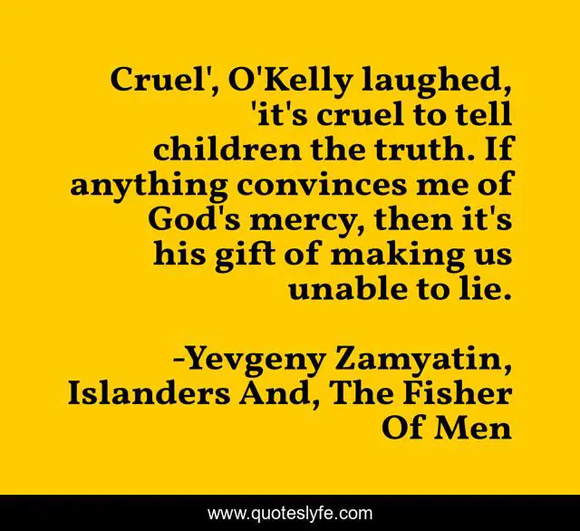 This page presents the quote "Cruel', O'Kelly laughed, 'it's cruel to tell children the truth. If anything convinces me of God's mercy, then it's his gift of making us unable to lie.". Author of this quote is Yevgeny Zamyatin, Islanders And, The Fisher Of Men. This quote is about lie, cruel, lying, cruelty, truth,.